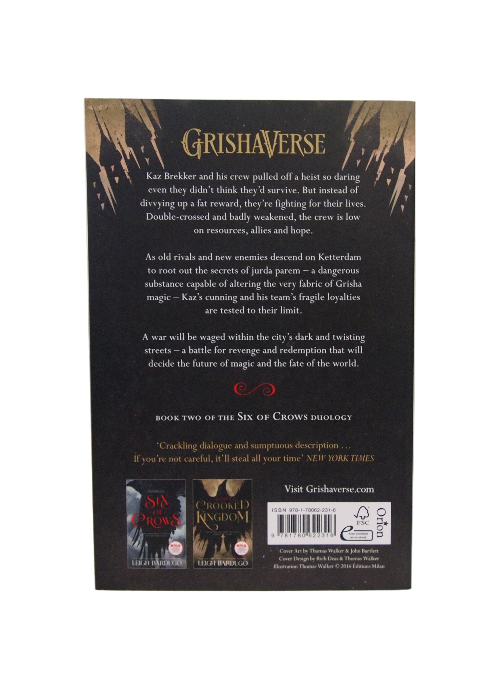 Kaz Brekker and his crew have just pulled off a dangerous heist, but their troubles are far from over. Double-crossed and weakened, they must fight for their lives and their city as powerful forces close in. Loyalties are tested, hearts are broken, and the price of revenge may be higher than anyone expected. In this gripping conclusion to the Six of Crows duology, the stakes are deadlier, the schemes more daring, and every choice could mean freedom—or destruction.