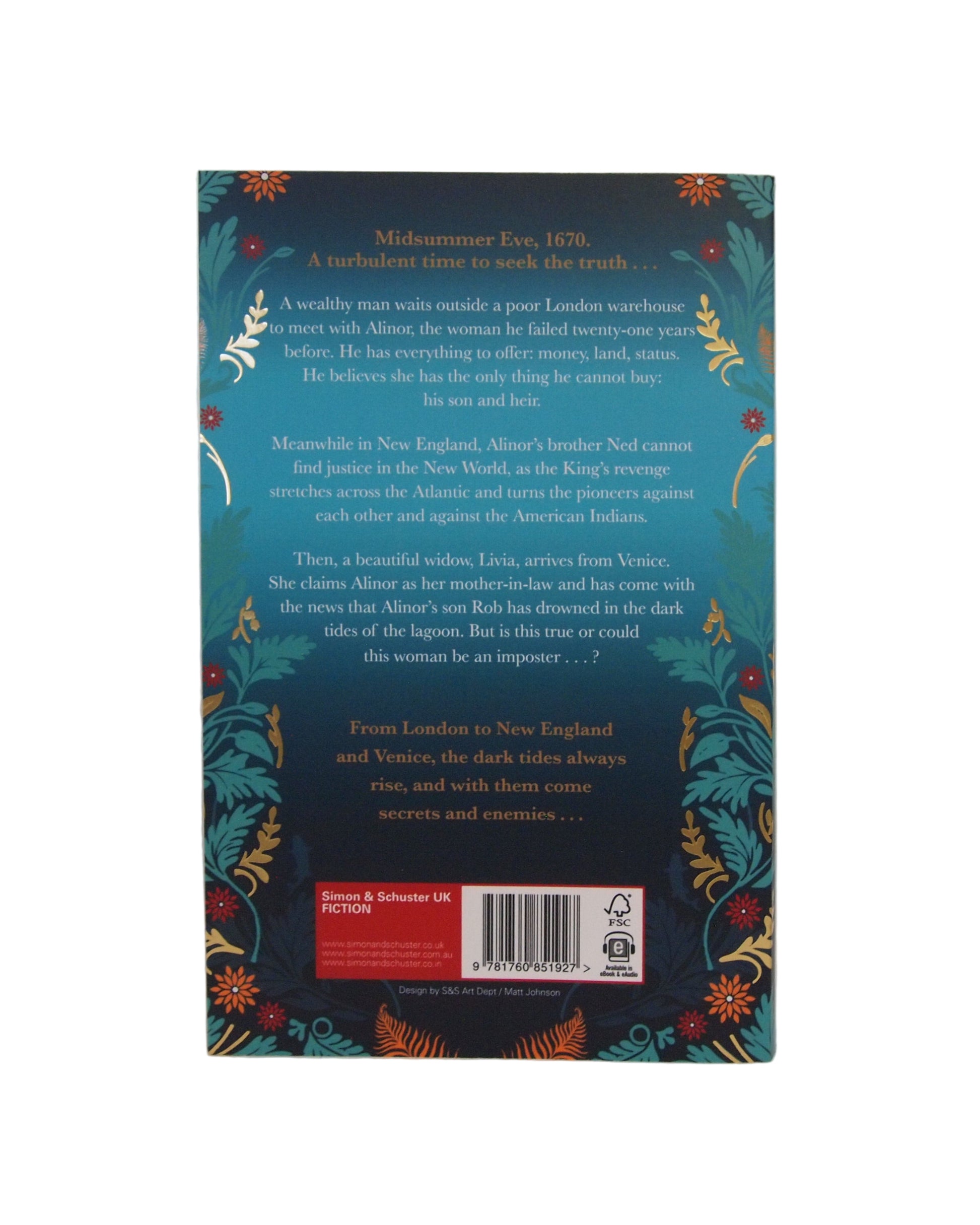 Midsummer Eve, 1670. Twenty-one years after she was left by the man she loved, Alinor has built a life for herself and her family on the banks of the Thames in London. When two unexpected visitors arrive—James Avery, wealthy and determined to claim Alinor once again, and a Venetian widow named Livia who insists Alinor’s son drowned in the lagoon—Alinor refuses to believe it. Convinced her son is still alive, she senses deception. Meanwhile, her brother Ned struggles in New England as tensions mount between settlers and Indigenous people. Moving between London, Venice, and America, Dark Tides is a sweeping story of secrets, ambition, and a mother’s unshakable faith.