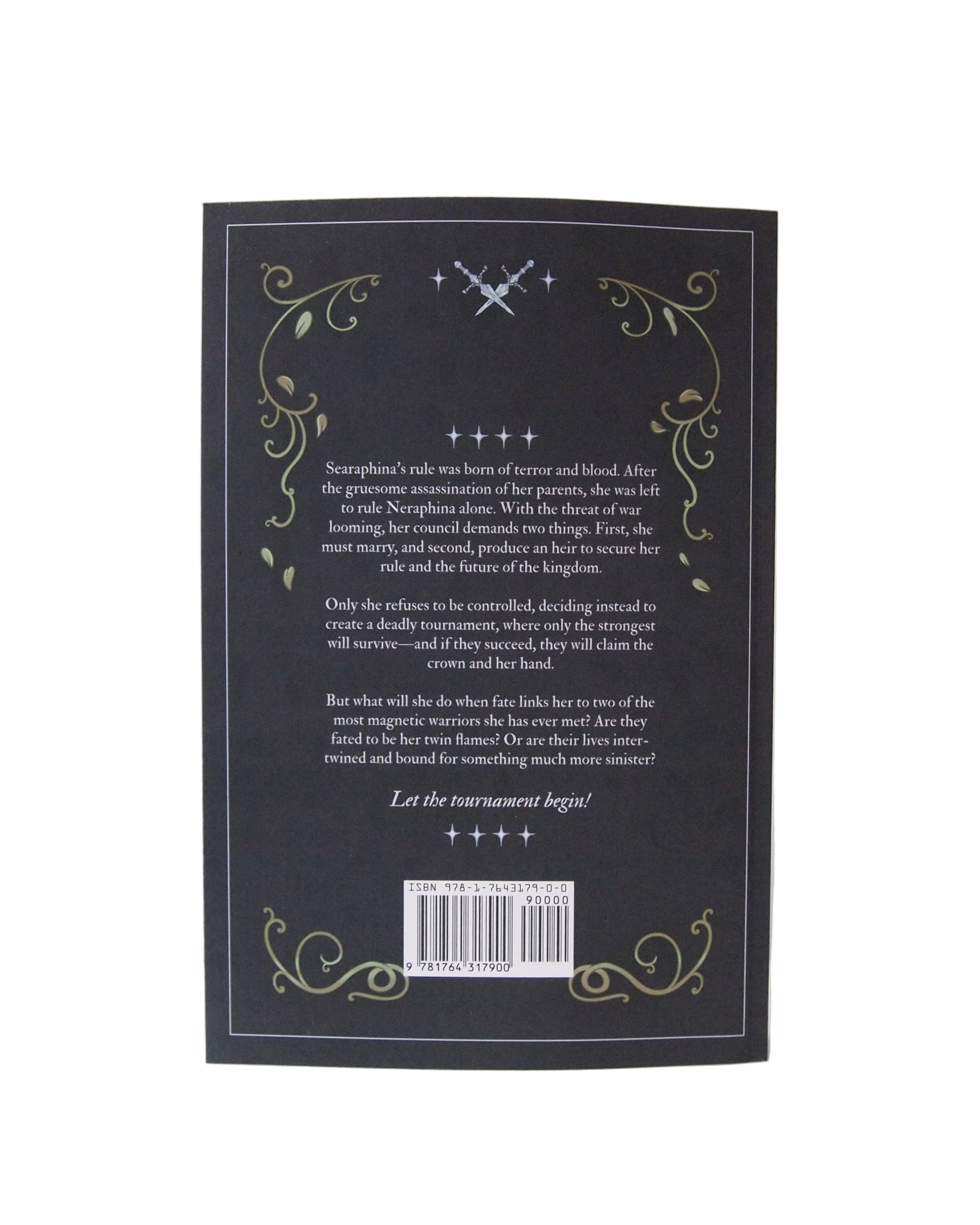 Searaphina's rule was born of terror and blood, after the gruesome assassination of her parents, she was left to rule Neraphina alone. With the threat of war looming her council demands two things. First, she must marry and second produce an heir. To secure her rule and the future of the kingdom. Only she refuses to be controlled. Deciding instead to create a deadly tournament, where only the strongest will survive and if they succeed they will claim the crown and her hand. But what will she do when fate links her to two of the most magnetic warriors she has ever met? Are they fated to be her twin flames? Or are their lives intertwined and bound for something much more sinister. Let the tournament begin!