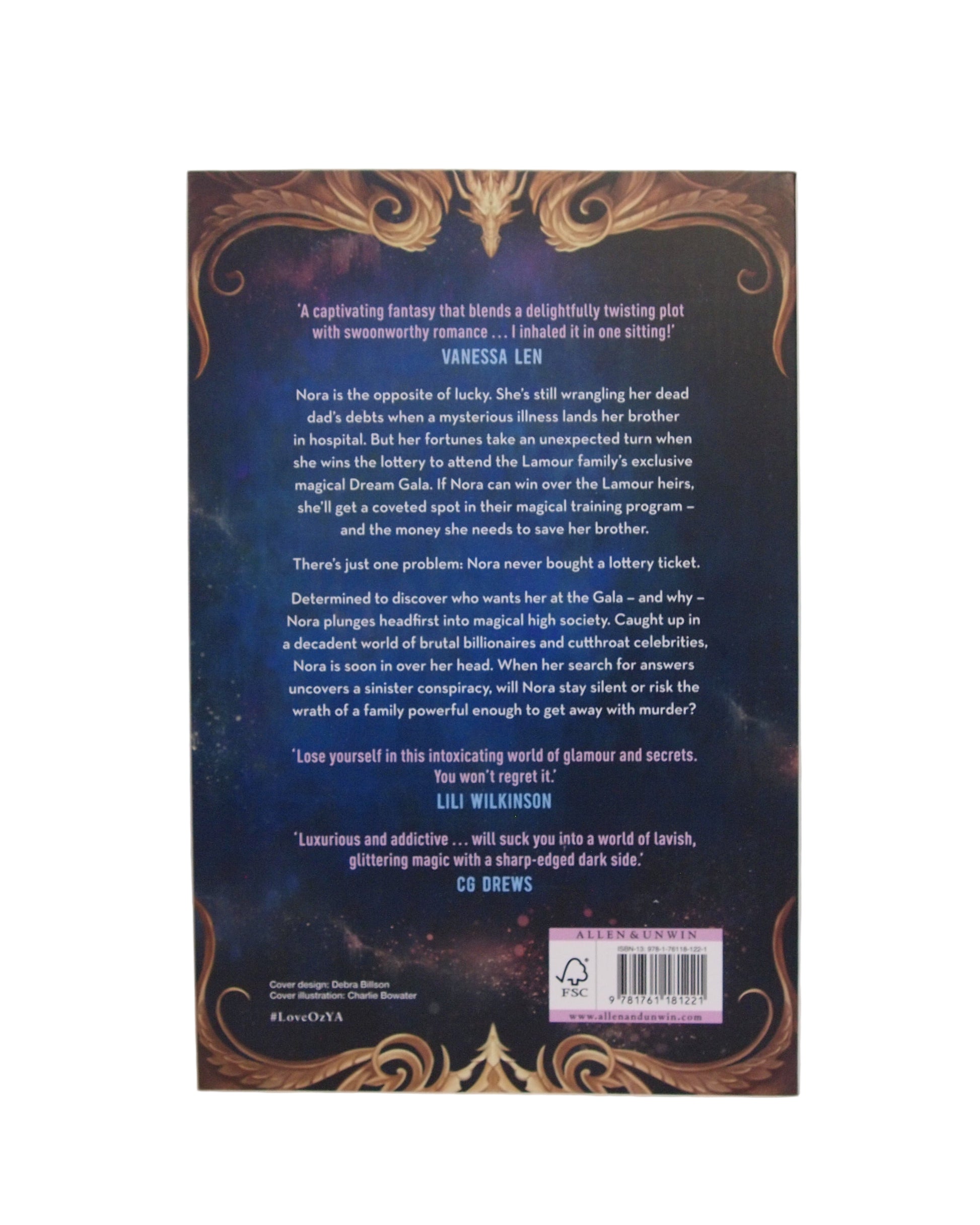 Sometimes you have to kill a dream to escape a nightmare. Eighteen-year-old Nora Blake is anything but lucky. After her father’s death, she’s left with crushing debts and a brother in hospital. Her chance at escaping that life comes when she miraculously wins a lottery ticket to the Dream Gala ― an exclusive, magical event run by the powerful Lamour family. If she can win over one of the Lamour heirs, she’ll earn a spot in their magical training program, and the money she needs to save her brother. But there’s a catch: Nora never bought a lottery ticket. Drawn into the opulent yet dangerous world of magical high society, Nora discovers that behind the glamour, the Lamours guard sinister secrets. With her life, her loyalties, and her heart at stake, Nora must decide whether to stay silent or risk everything to uncover the truth.